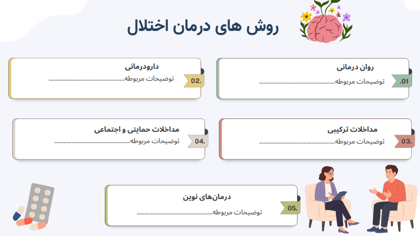 یک قالب حرفه‌ای برای ارائه اختلالات روانی؛ با تیترها و زیرتیترهای از پیش آماده، طراحی منظم و تصاویر جذاب.